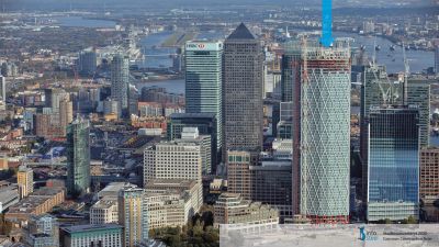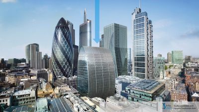 Tekst: 70 St Mary Axe, known informally as the ‘Can of Ham’ because of its curved shape, is an office building in the City of London. Rising to a height of 90 m, it has 24 storeys and a footprint of 48 x 40 m. The load-bearing steel structure of columns and floor beams is built around a concrete core that houses all the pipes, lifts and stairs, and the steel skeleton contains almost 3,000 tonnes of grade S355 steel. The columns are a combination of UC profiles and UCs with welded-on plates; floor beams are either welded-together sheet steel girders or UC profiles. The construction technique selected for the floor – the 33,000 m² floor plates are made of 0.89 mm galvanised steel profiled sheets filled with lightweight concrete – meant that it could be walked on within a week. Each floor comprises an average of 100 structural steel elements that took on average 1.5 weeks to assemble per floor. The roof structure is made up of 5 curved composite profiles.