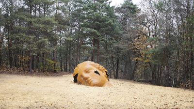 Tekst: A giant sculpture has been erected at the highest point of the Kempense Heuvelrug near Kasterlee. This permanent structure, which sits atop the 30 m high dormant land dune of the Hoge Mouw has been designed especially for the site, and comprises a faceted head made up of 2,115 welded-together 6 mm metal triangles in the form of a dome. Pieces have been cut out in places and you can walk into the hollow space within the sculpture from one side. The colossus measures 6 x 5 x 3 m and weighs around 2 tonnes, its size bringing to mind excavated fragments of sculptures from ancient times. The work thus toys with art-historical and site-specific references that spring from the extraordinary nature of the place, whilst at the same time forming a new, alien element in the landscape that fuels the creation of new myths.