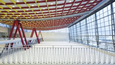 Tekst: Built for Expo 58, the transit hall at Zaventem airport was an impressive feat of engineering that involved completely covering a space 100 m long, 55 m wide and 18 m high with an arch-shaped aluminium roof structure. This roof structure has now been reinforced from above to give the glorious ‘Skyhall’ a second life. A steel truss construction with the same cantilever as the original aluminium structure has been integrated into the existing roof, making it possible to retain the original roof and ceiling. The A-shaped trusses have been reinforced to support the new roof structure, which comprises 521 tonnes of S355 steel, and also carry a walkway on V-shaped steel columns flanking a monumental staircase. Three rectangular steel tubes serve as stringers, with a horizontal span of 13 m and no intermediate supports.