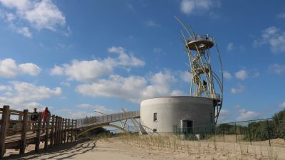 Tekst: The old water tower in the Warandeduinen nature reserve was due for a thorough renovation, but it was still performing its original function of providing drinking water to a large part of Middelkerke. Since the region could not do without its water supply, the base was left in place, allowing the pumping station to keep on operating. In the new design, nature, sand and wind are given free rein, with a raised wooden boardwalk that transitions into a bridge limiting the impact at ground level. A new structure has been added on top of the retained base, in which an eye-catching bundle of tubes winds its way around a spiral staircase. This array of galvanized and lacquered tubes is a reference to the area’s characteristic marram grass. The blades support the spiral staircase, a rest platform and a 20 m high panoramic platform. The use of steel gave rise to light open structures that contrast nicely with the existing solid base. It also meant that the structure could be prefabricated, allowing work in the protected dune area to be kept to a minimum.