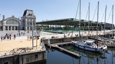 Tekst: After seven years of refurbishment and conversion work, the finishing touch was finally added to Oostende station: a roof. The project included the redevelopment of the tram station and parking areas, the restoration of the historic station building, the construction of a series of new platforms, and the replacement of the ageing railway platform canopies by a roof covering railway, tram and bus platforms as well as the underground bicycle storage facilities. The architects sought to recapture the original grandeur of the platform roofing by designing an 11m high translucent platform roof in colours reminiscent of the sea – blue, green, yellow and white. The interplay of light and colour filtering through this creates a warm and pleasant atmosphere. The columns of the steel structure consist of four tubes that flare out at the top. On top of the 3D-lasered tubular columns, double I-beams run in both directions.