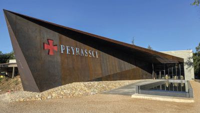 Tekst: Visitors to the Commanderie de Peyrassol wine estate are greeted by a number of structures in weatherproof Corten steel. The first is an impressive 36-tonne entrance canopy with a 7-metre cantilever covering a total length of 32 metres and standing 7.5 metres tall at its highest point. The canopy culminates in a spire made of simplex-shaped tube with cladding in 5 mm weather-resistant sheet steel supported only by 15 mm thick vertical stiffeners varying in height between 315 mm and 30 mm. Inside the building, the curved, 5-metre high ‘bottle rack wall’ made of reinforced 3 mm steel plates extends to a length of over 20 metres and supports the floor plate of a storage room. A gallery made up of five 8.2-metre modules in Corten steel connects the reception and tasting rooms to the vineyards. The finishing touch is provided by the monumental Templar Cross, which towers 9 m above the visitors’ car park.