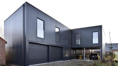 Tekst: The clients for this project were true car enthusiasts and wanted to build an industrial-themed home with enough space to store at least 4 cars. Almost the entire ground floor is dedicated to their beloved vehicles and there is also a large two-car garage, plus two covered parking spaces near the entrance. For financial and environmental reasons, a steel structure was chosen for the construction of these large open spaces and this was covered with sandwich panels comprising 15 cm PIR insulation. The roof was fitted with steel deck panels and 16 cm PIR insulation. In addition to the insulation, environmentally friendly building services such as solar panels, a heat pump and ventilation system D were also installed, helping the dwelling to achieve the required BEN rating with ease (*BEN = bijna energieneutraal (near energy-neutral). Said of a dwelling in Flanders that meets certain energy efficiency ratings (e.g. E-level of 30 or lower). Inside the house, the industrial character is further accentuated with the use of cable ducts and visible ventilation channels, resulting in an affordable and modern BEN-compatible home with an industrial twist.