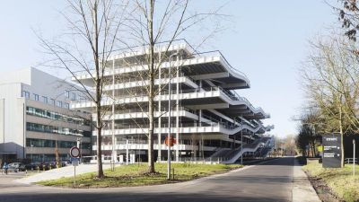 Tekst: The new parking garage on the Arenberg III campus in Leuven has 8 above-ground floors and provides space for 740 cars and 210 bicycles. It is constructed as a linear car park with the ramps on the outside of the north facade and 3 circulation shafts on the south facade. The slopes on the 142 m long facade along Kapeldreef lend a touch of expressiveness and dynamism to the building. This is architecture stripped back to the essentials: an open steel structure that enters into dialogue with its surroundings. The ramps carry over three bays (22.5 m) between the horizontal surfaces that connect to the parking levels. The span of the ramps is realised using HEB800 profiles that also provide the facade finish for both the ramps and the ends of the building. The floor plates are made of profiled sheet steel and concrete floors that have been left exposed at the bottom.