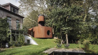 Tekst: A tearoom on the edge of the Zoete Waters in Oud-Heverlee dating back to the 1950s has been given a new lease of life as a wellness centre and luxury holiday home. The existing building was topped with steel porticos and wooden joinery before being clad with weather-resistant steel. Near the bedrooms, the weatherproof steel cladding features a specific perforation pattern that allows light to enter without compromising privacy, whilst also emphasizing the geometry of the building. An image of a birch forest has been laser cut onto the side, behind which the ventilation facilities are hidden. Because of the weight of the addition, combined with the fact that the existing bungalow had weak foundations and lightweight load-bearing walls, the superstructure is made of HEA-section steel gantries. The weatherproof steel blends in perfectly with the surrounding nature and ensures seamless integration into the landscape.