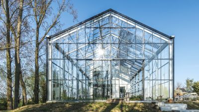 Tekst: In Sweden or the Netherlands, no-one would bat an eyelid, but in Belgium a house inside a greenhouse is a bit of an oddity . The greenhouse dwelling is a 170 m2 timber-frame building encased in a 30 x 12.20 m greenhouse with a ridge height of 9 m. It’s a double-skinned house in which the outer skin – the glass greenhouse – forms a microclimate around the house and the office space. The greenhouse is a classic glass-and-steel structure (with single glass for the walls and laminated glass for the roof) that creates a microclimate within it, protecting the house and garden from the wind and weather. Everything is screwed together so the greenhouse can be completely dismantled if necessary. Ultimately, the intention is for the house to be off-grid, i.e. not connected to the public water supply, public sewer system and gas and electricity networks. This is still a work in progress, as the power requirements for the different seasons and conditions have yet to be tested.