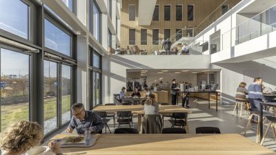 Tekst: The Vandemoortele Group’s ‘Food Experience Centre’ in Ghent has been designed as a material bank. The steel supporting structure is fully detachable, modular and adaptable, as are the curtain wall systems that envelope the building structure. The HE 280 A columns along the facade line taper upwards to HEA 180 columns on the third level, whilst the girders consist mainly of HEA profiles. Four walkways in the atrium establish a connection between the east and west facades; the largest of these in the middle has two vertical struts in the form of 60.3 x 4 mm tubular profiles anchored to the shed roof. The steel-plate-and-concrete floor is 11 cm high to guarantee a fire resistance of R60, and the main structure of the shed roofs is made of four-part S355 girders with a span of 18.6 m and a height of 1.74 m. For the most heavily loaded four-part girders, square K220/10 box sections were used as top and bottom rails. The vertical posts are made of square K220/8 tubular profiles.