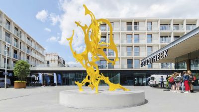 Tekst: This sculpture features the characteristic ‘blob’ that the artist often uses on a smaller scale. The entire oeuvre is permeated with contrasts between conventional architectural models (boxes) and virtual designs (blobs) but here the artist chooses a third way, opting for a synthesis of both. This results in forms that are removed from their virtual space and transformed back into a graphic abstraction, giving rise to a dynamic drawing that harks back to traditional graphic techniques whilst also referencing contemporary graffiti and digital design. The ultimate aim was to make the facade area more attractive and transform it into a landmark. The design was mounted on the facade of the tower where mounting points were provided at strategic places. The sheets of weather-resistant Corten steel, most of which had been supplied pre-assembled, were then screwed into place.