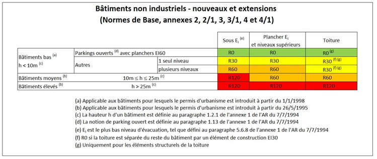 Pour les bâtiments industriels, la classification se fait en fonction de la charge d'incendie attendue d'une part, et de l'importance de l'élément structurel en cas d'effondrement (par le feu) d'autre part.  Ceci est expliqué plus en détail dans la rubrique Bâtiments industriels (Belgique).
