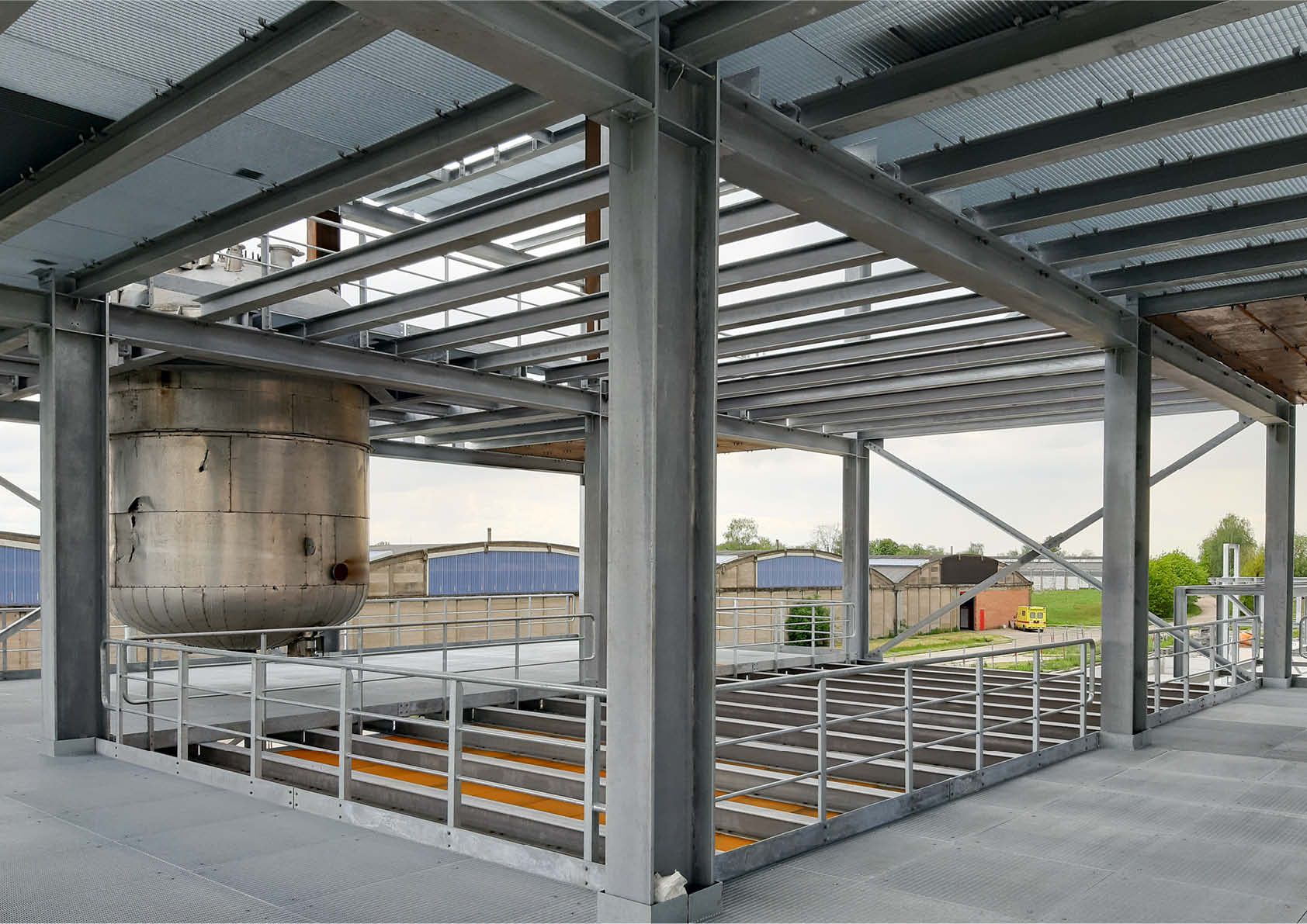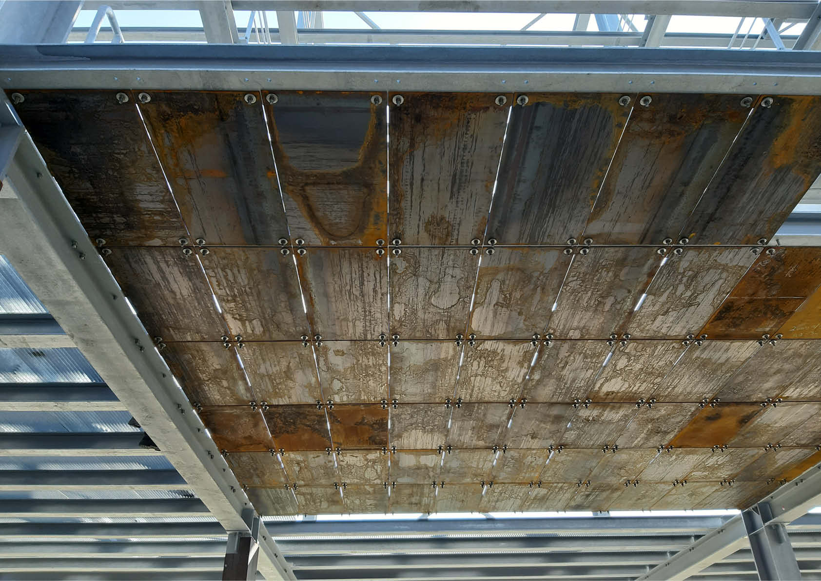 Tout l’acier de construction est de qualité S355. Toutes les poutres de sol, à l’exception des poutres qui font partie des liaisons de stabilité, sont également dilatées par rapport aux colonnes pour permettre la dilatation thermique. Afin d’éviter tout contact direct entre les flammes et la construction, les colonnes et les sols critiques ont été recouverts de 320 m² de panneaux de protection en acier Corten.