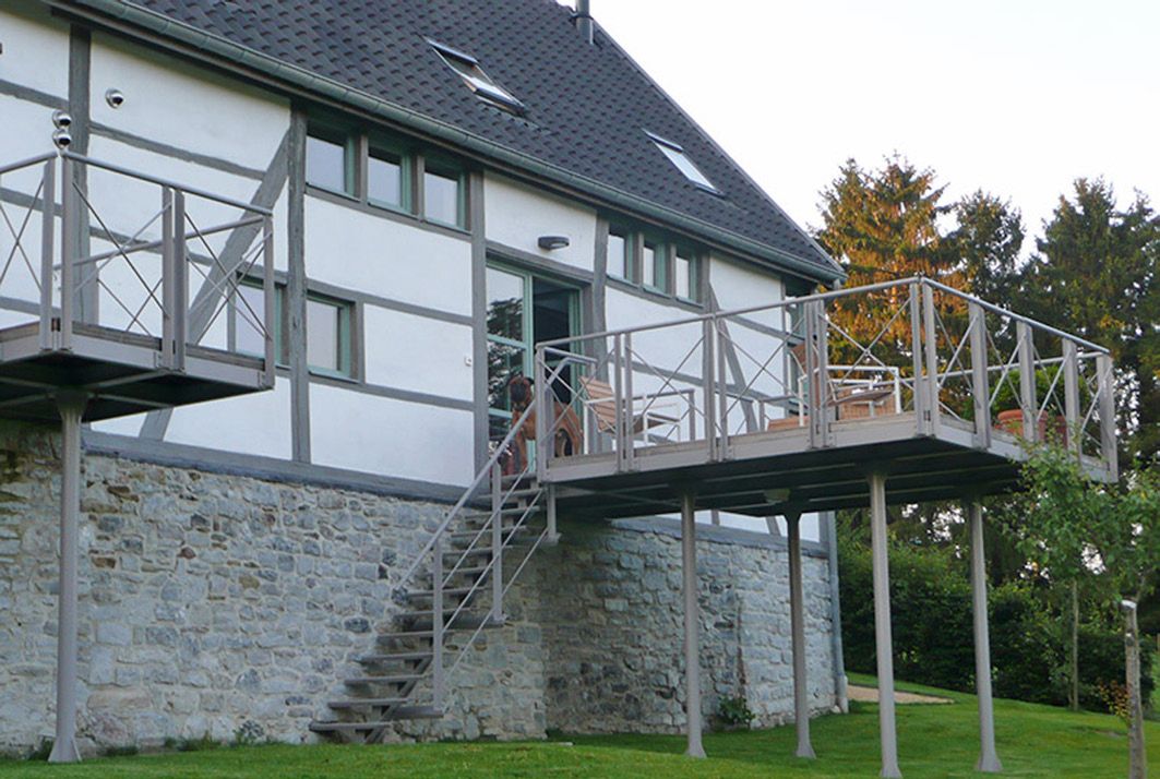 Le projet consiste en la restauration, en deux habitations et selon le style d’époque, d’une fermette à colombages du XVIe siècle. La restauration de la partie habitée fut réalisée sur site. Une fois la partie étables démontée, le choix du matériau de structure a été l’acier, pour son coût, sa manutention, ses qualités techniques. L’acier fut également employé pour la réalisation de deux terrasses aériennes et de deux escaliers métalliques.