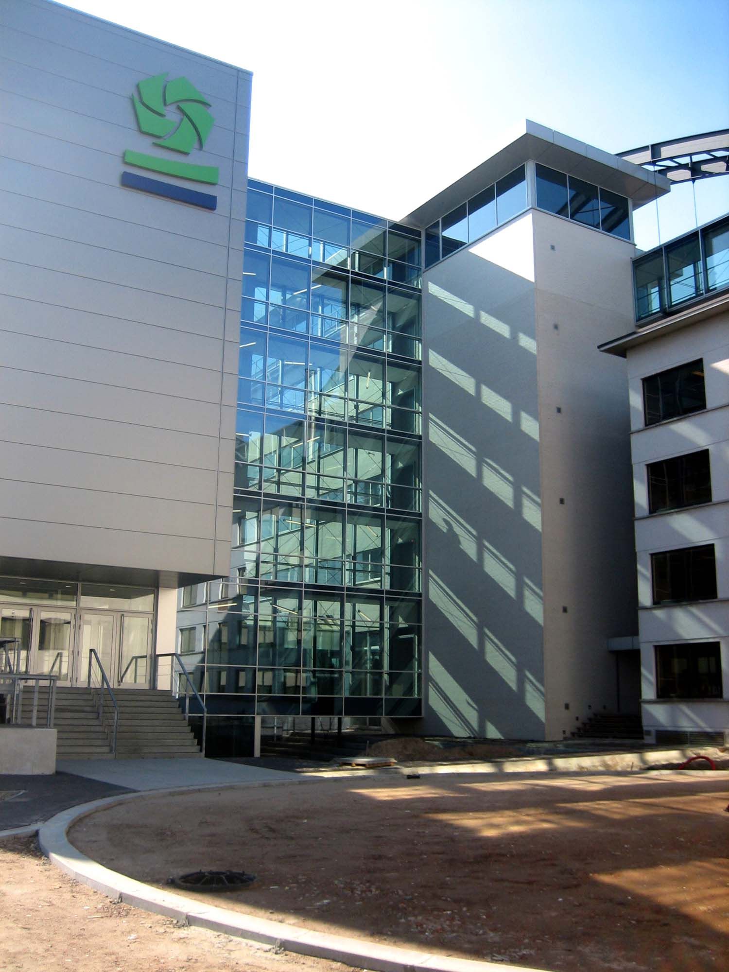 >La légèreté de la structure a été obtenue par l’utilisation d’un cadre en acier renforcé par des barres en tension et parachevé au moyen de façades en verre. La finition a été complétée par quelques éléments plus petits tels qu’escaliers et rampes d’accès, eux aussi réalisés en acier. Par le choix de l’acier et du verre, les couloirs de liaison ont dépassé leur caractère purement fonctionnel. Leur légèreté et leur modernisme apportent une plus value aux deux ailes de la société, l’ancienne et la nouvelle.