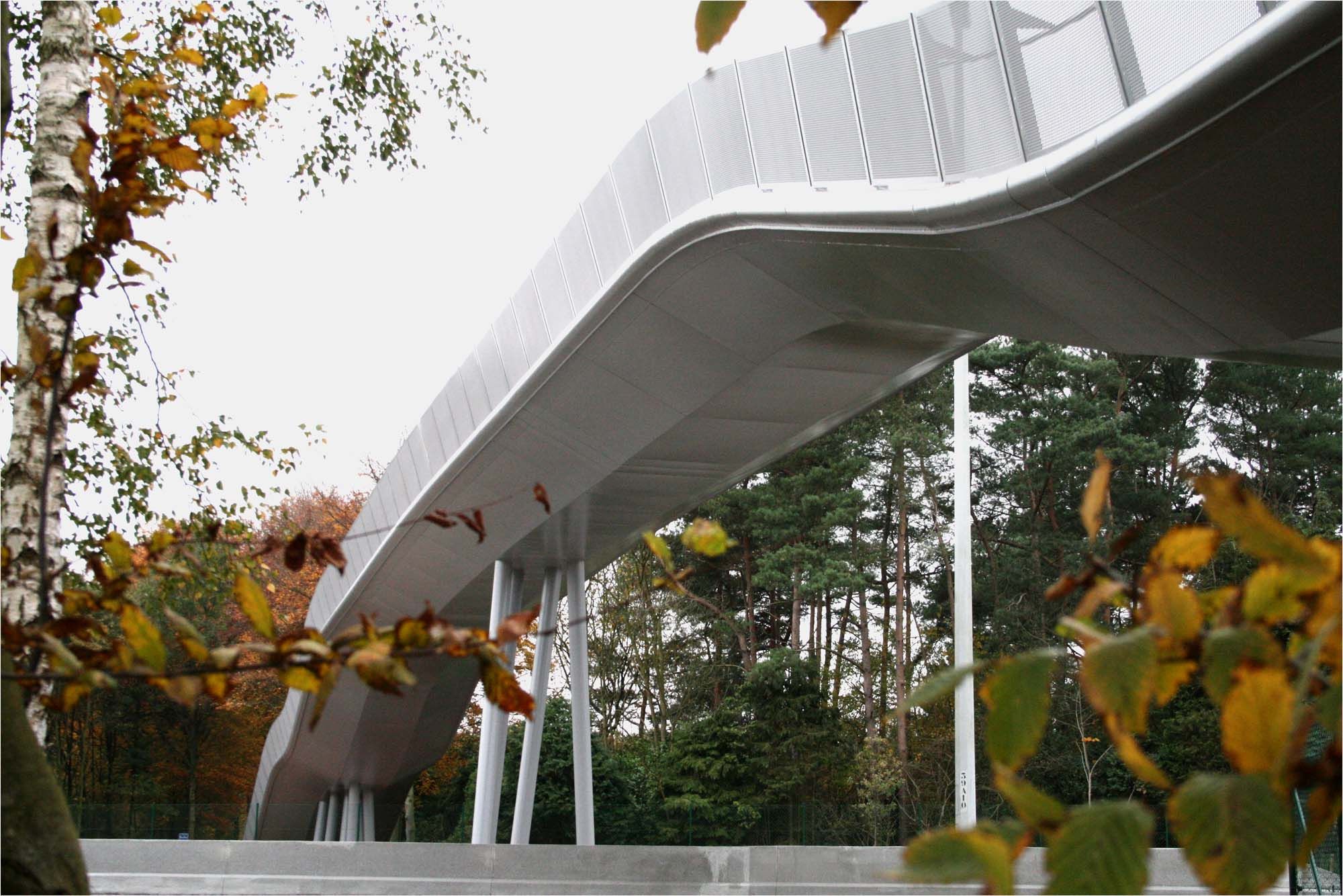 Pour franchir la voie rapide à Bruges, le choix s’est porté sur une ‘passerelle paresseuse’, combinaison d’une passerelle et d’un escalier pour vélos. La particularité est l’application décroissante de la formule de l’escalier, c’est-à-dire que les marches ont des dimensions différentes. Le tablier de près de 4 m de large est constitué de tôles d’acier de 10 mm d’épaisseur, rigidifiées par 7 raidisseurs longitudinaux. Deux grandes cloisons longitudinales transforment la partie centrale en caisson. De chaque côté de celle-ci se trouvent des sections dont la face inférieure est oblique et se prolonge dans le bord rond de la passerelle. La passerelle est constituée de quatre travées et peut se déformer librement dans le sens de la longueur, de manière à éviter tout effet de ressort. Des renforts intérieurs ont été appliqués aux endroits où les piles supportent le tablier. Dès la conception, il était évident que cette structure élégante ne pouvait être construite qu’en acier.