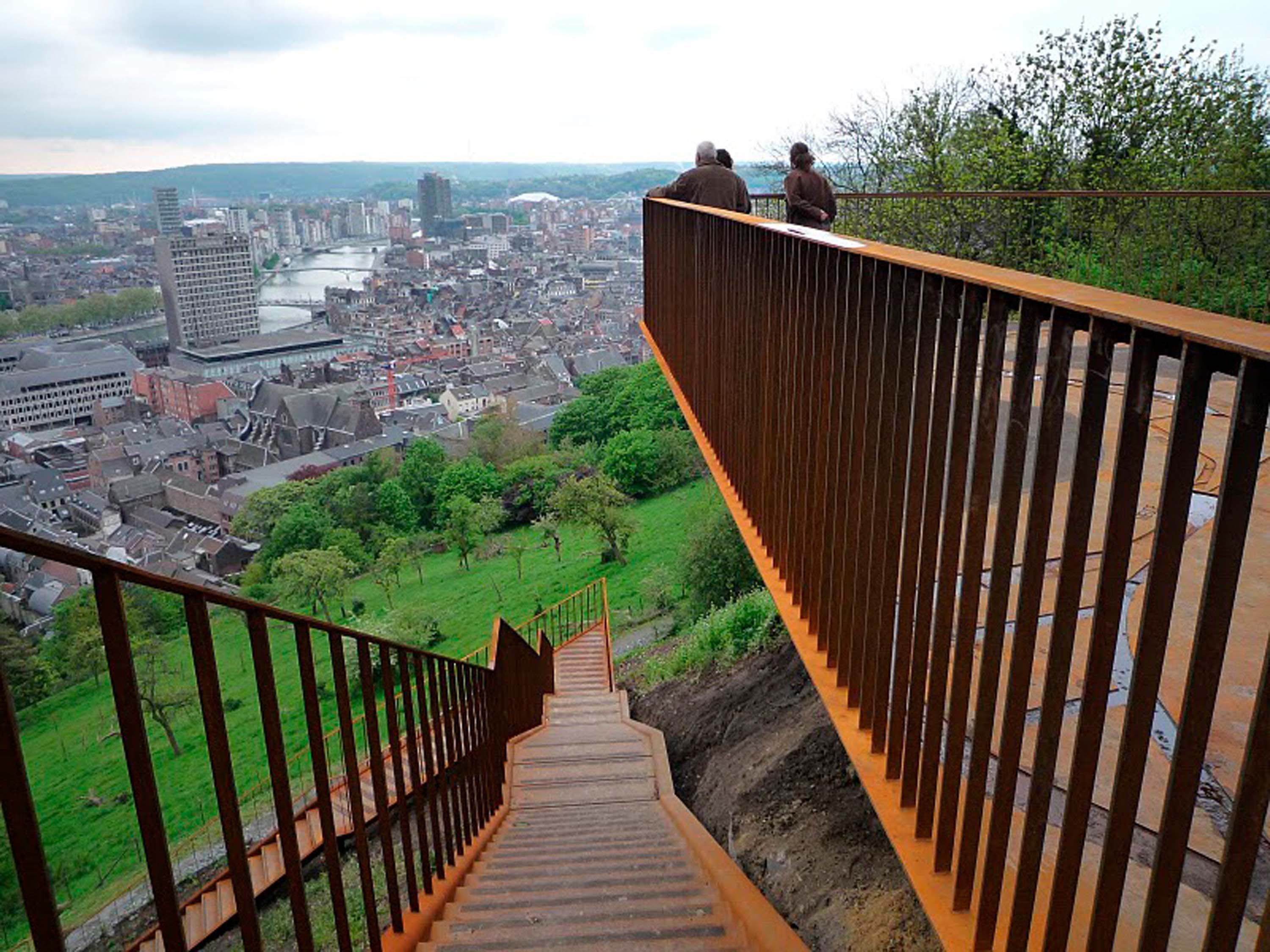 Constituée d’une plate-forme d’observation d’environ 45 m² et d’un escalier de 50 m de long le reliant à un sentier, cet ouvrage fait partie intégrante des circuits piétonniers de découverte touristique de la ville de Liège. L’intégralité de la structure constituant la plate-forme - les 2 volées d’escaliers, le palier et les garde-corps - sont réalisés en acier auto-patinable et reposent sur des fondations en béton.