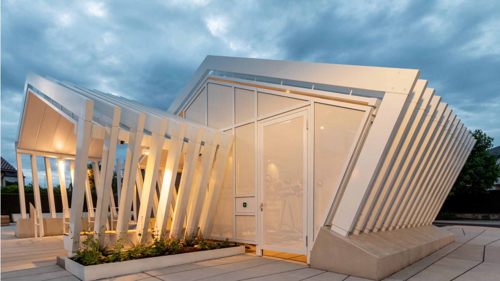 L'esthétique du lieu se caractérise par un design minimaliste, géométrique et épuré. Le pavillon reflète le motif trapézoïdal des dalles de béton, également conçues sur mesure. La blancheur et la transparence de la structure créent une impression de légèreté, s'harmonisant parfaitement avec l'environnement.