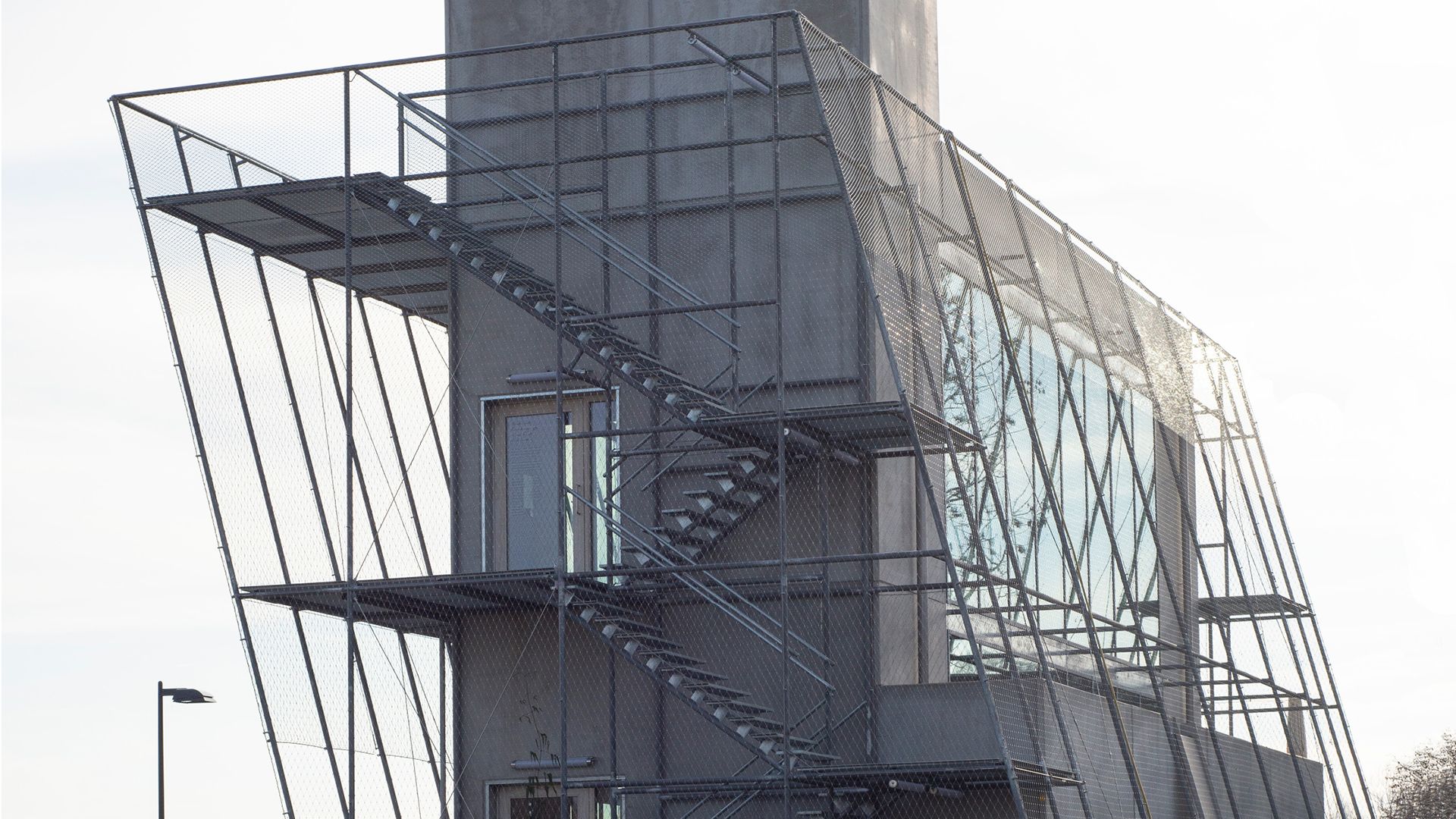 Un squelette en acier léger a été érigé autour du bâtiment en béton, penché vers l'eau et entouré d'un treillis de câbles. Entre le bâtiment et la seconde peau, deux escaliers extérieurs sont intégrés aux extrémités, montant en spirale depuis le talus jusqu'à un point de vue public sur le toit. À terme, la structure en acier sera recouverte de plantes grimpantes, ce qui permettra au bâtiment de se fondre dans le paysage.
