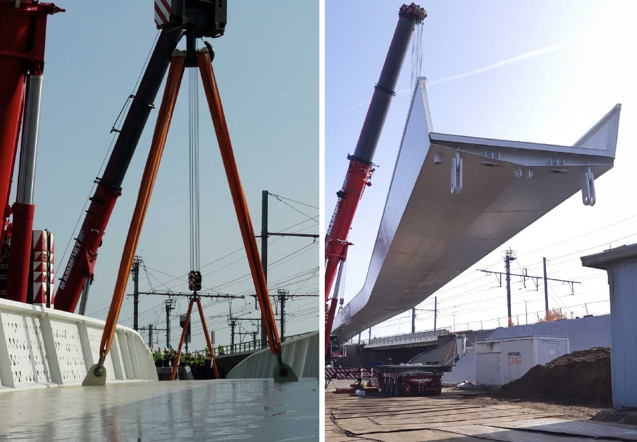 Le pont Gerarda à Sint-Niklaas un projet qui est bien plus qu'une simple liaison fonctionnelle. Il s'agit d'une invitation à bouger, à explorer. Le pont a été conçu comme une piste cyclable aérienne presque parfaitement rectiligne, alliant confort et lisibilité intuitive à une intégration spatiale raffinée. SBE a réalisé l'étude complète pour ce pont. Implanté dans un environnement urbain complexe, l'objectif était clair : le pont devait être plus qu'une simple infrastructure. Il devait constituer un nouveau geste urbain. Une porte d'entrée vers la ville. Alors qu'aujourd'hui, le pont ferroviaire et routier au-dessus de Vijfstraten constitue un accès plutôt banal, ce projet saisit l'occasion de créer un lieu significatif, un point de repère plein de caractère. Le pont enjambe 92 m d'un seul mouvement fluide et assuré. Il est élancé, élégant et d'une légèreté prononcée. Chaque détail a été pensé : la structure en acier en forme de U, la section transversale continue, les garde-corps découpés au laser qui sont à la fois décoratifs et structurellement significatifs. Les perforations jouent subtilement avec la lumière et la perspective.