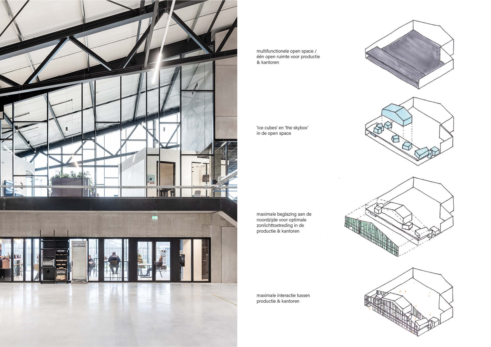Het is zeker niet standaard om een productie-eenheid uit te rusten met een zadeldakstructuur, maar het komt de visuele synergie ten goede. De stalen vakwerkspanten lieten ons eveneens toe om heel grote overspanningen te realiseren, zodat de productiehal volledig vrij is van kolommen en één open ruimte vormt. Dat is ook interessant met het oog op de toekomst, want het gebouw kan zonder al te grote aanpassingen een nieuwe functie krijgen.