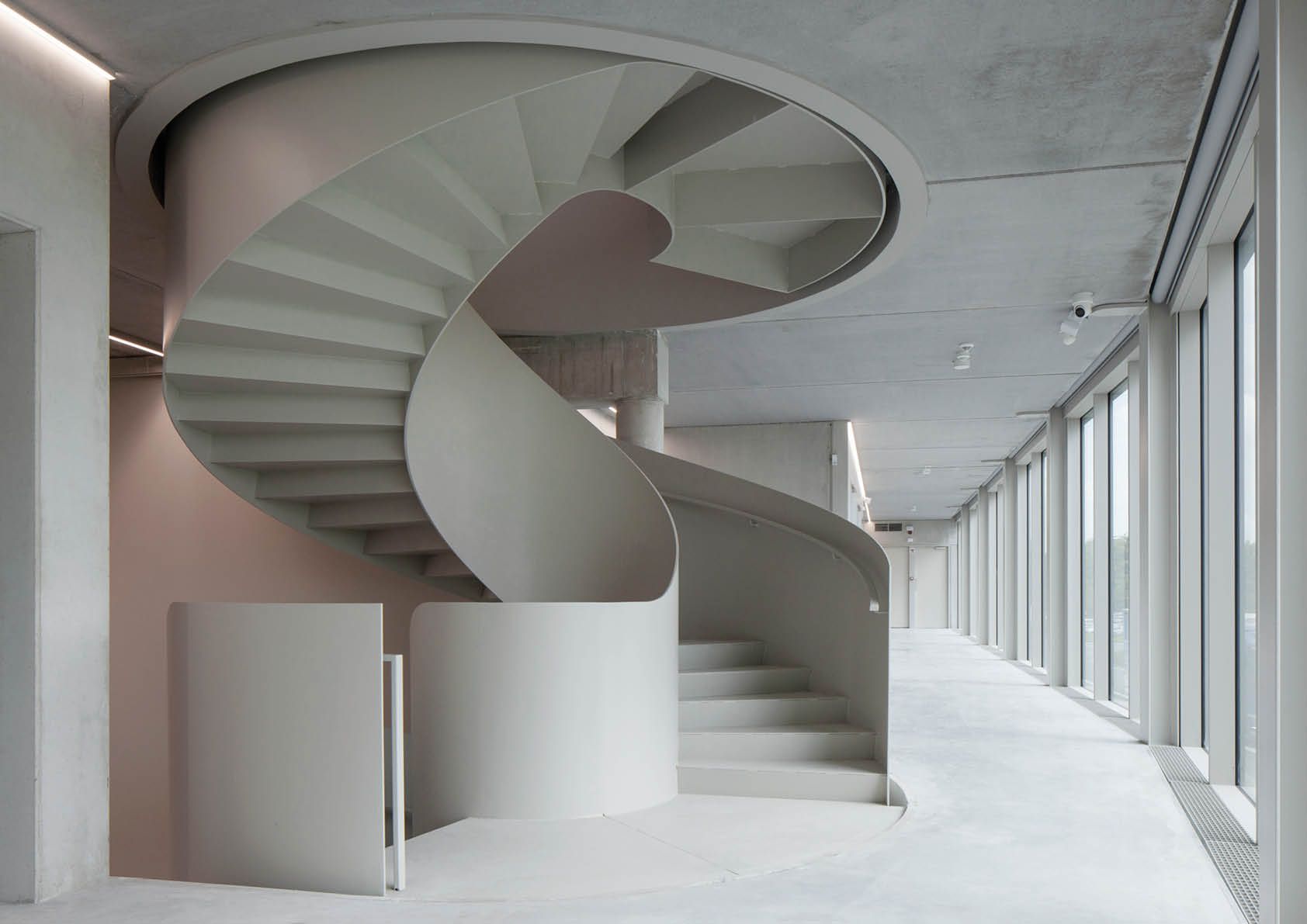 Op het gelijkvloers is een gemeenschappelijke vergaderzaal gekoppeld aan de genereuze inkomhal met uitnodigende ronde trap, die de vloeiende verbinding tussen de drie bouwlagen symboliseert. De zoektocht naar een elegante vormgeving mondde uit in de realisatie van een zelfdragende staalconstructie van 7,8 ton. De trap werd in twee verdiepingshoge delen geprefabriceerd in het atelier. Binnen in het volume van de trap zijn de bordessen verwerkt. Daar zijn de trapwanden doorgetrokken, zodat de onderbreking niet zichtbaar is in het volume. Op die manier ontstaat een imposante architecturale trap met een sterke ‘présence’.